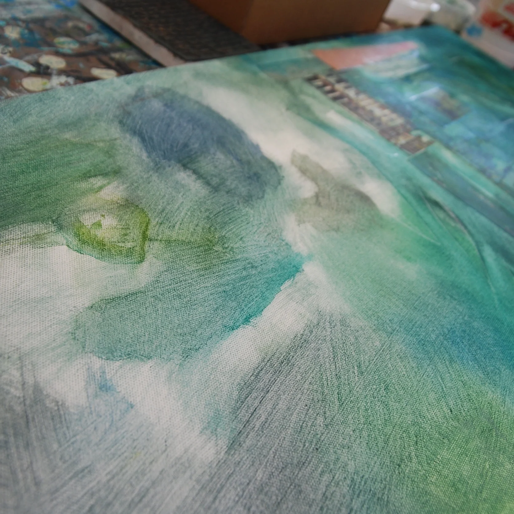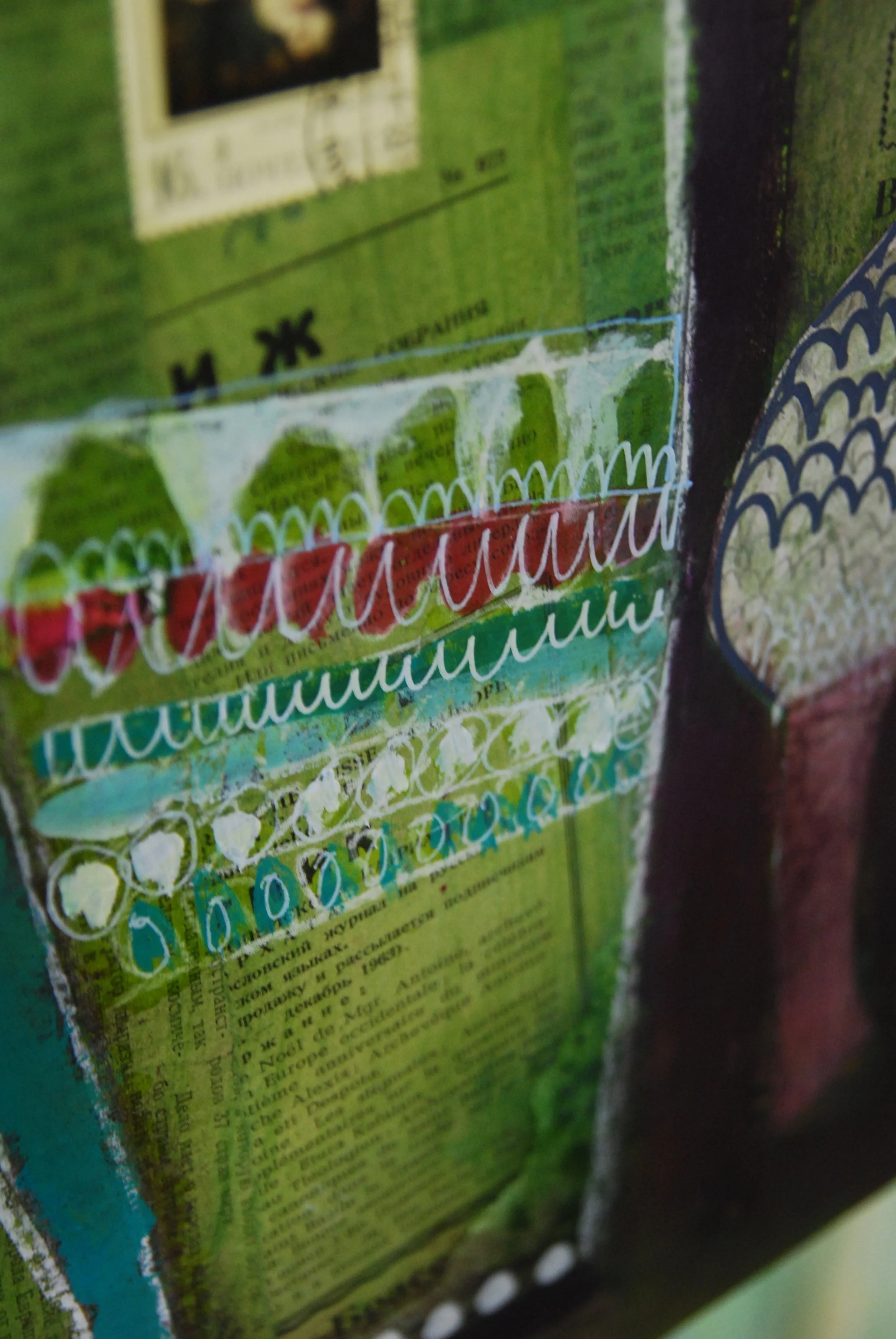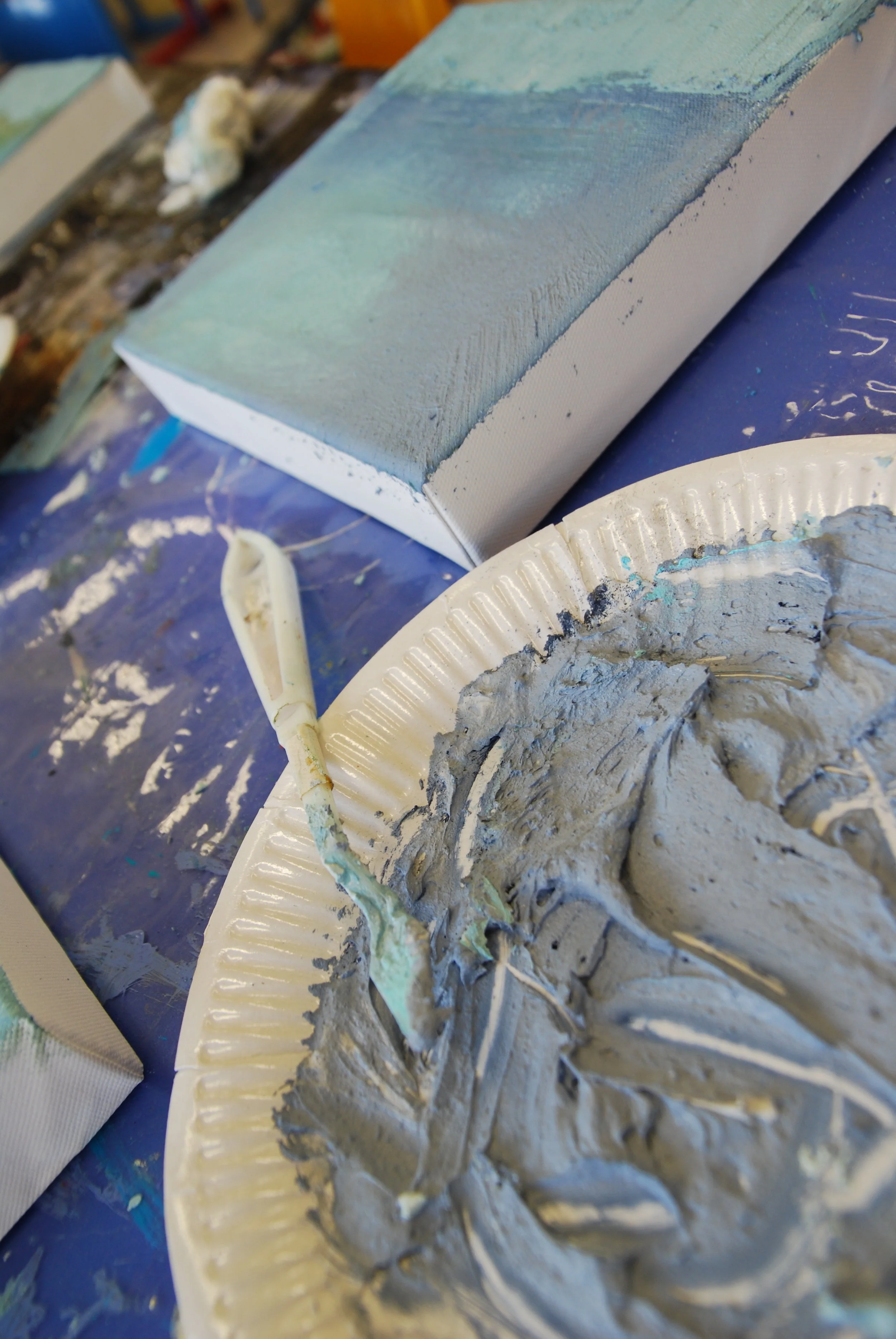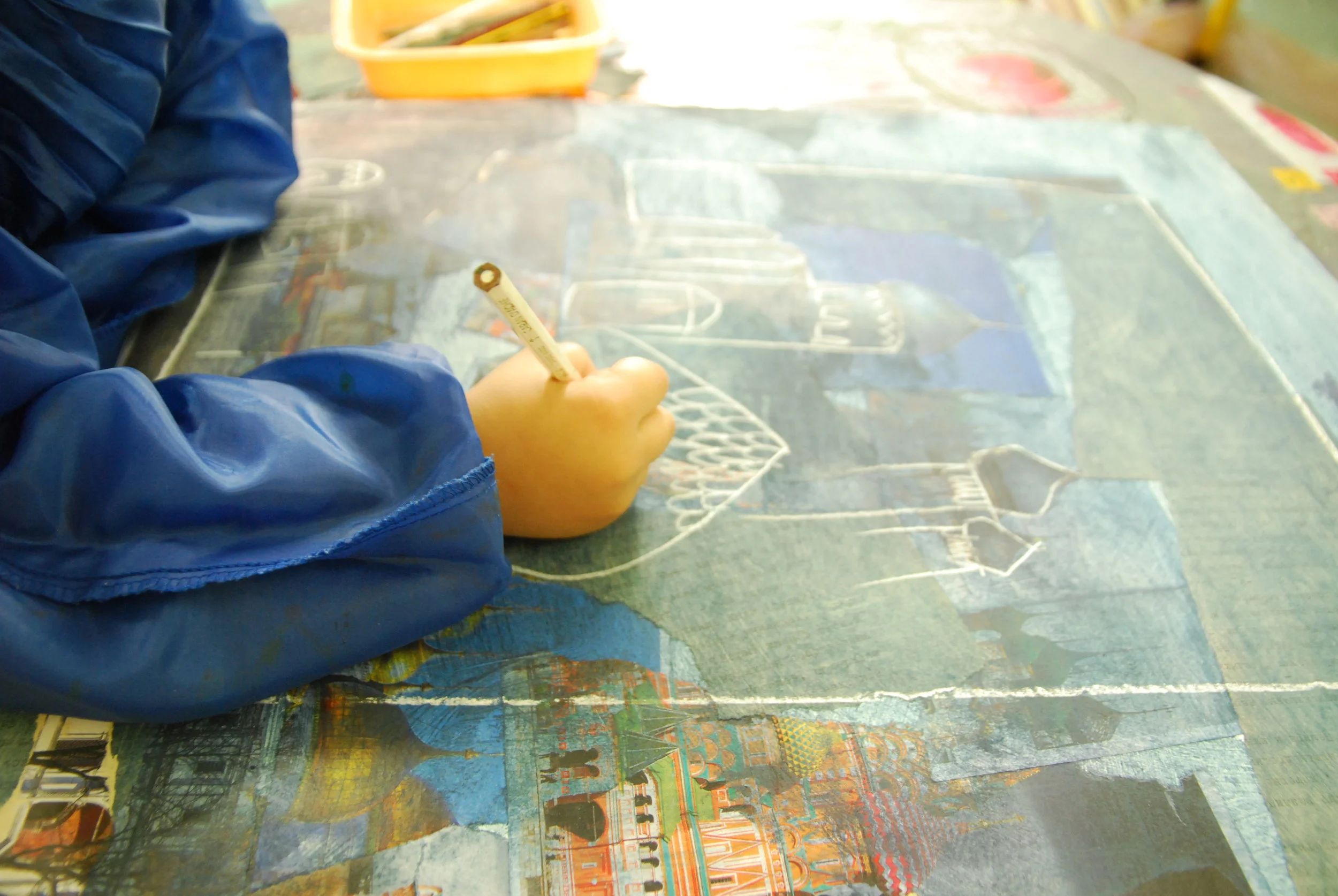 Mes ateliers se déclinent étape après étape, chacune étant l'occasion de manipuler un nouvel outil, de nouvelles matières, de découvrir une nouvelle technique: la spatule, le spalter, le calame, la craie sèche, le feutre Posca, la tarlatane, le kraft, les papiers chinés, les liants acryliques, la pâte à relief, le marouflage...