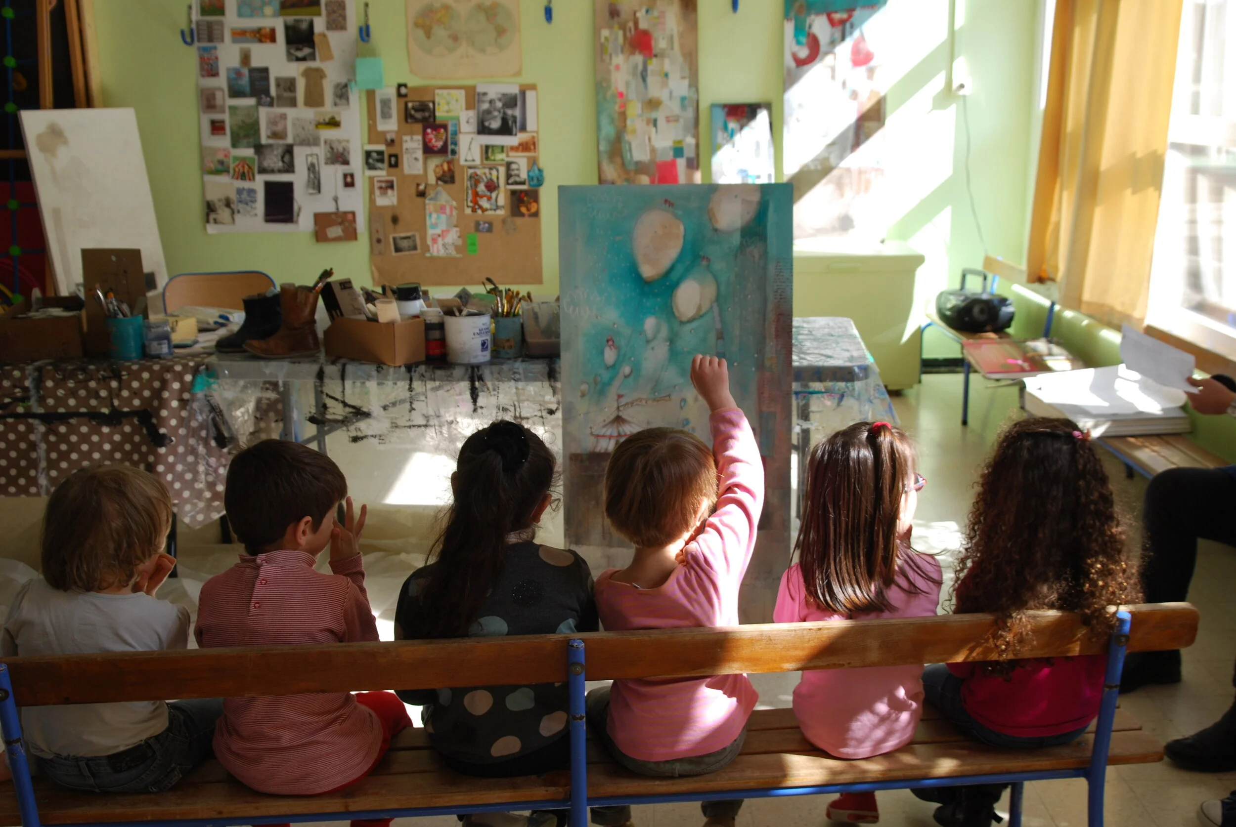Une fois mon atelier installé, les classes défilent pour échanger, interroger, observer. Les élèves découvrent mes outils de travail, apprivoisent le vocabulaire technique. Au fur et à mesure, les couleurs suggèrent une ambiance, les formes évoquent des habitations. J'invite alors les enfants à “entrer” dans le monde imaginaire du tableau, à se projeter, à créer des personnages. Une histoire se trame.